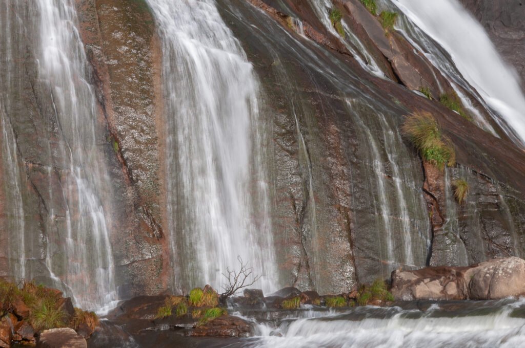 Desde el punto de vista geológico, el entorno está dominado por formaciones graníticas muy antiguas, modeladas por la erosión hídrica a lo largo de miles de años. El río ha excavado un cauce encajado que, en su tramo final, salva un desnivel abrupto formando la cascada. Estas rocas presentan fracturas y diaclasas que facilitan la acción del agua, generando superficies pulidas y canales naturales. La interacción constante entre el agua dulce y el ambiente marino cercano contribuye a la aparición de microhábitats específicos en las grietas y zonas húmedas.