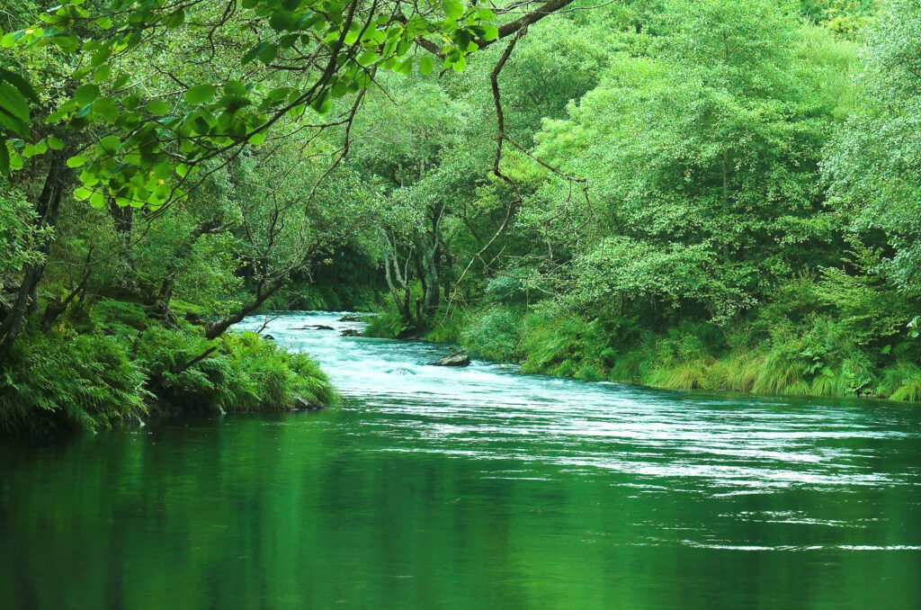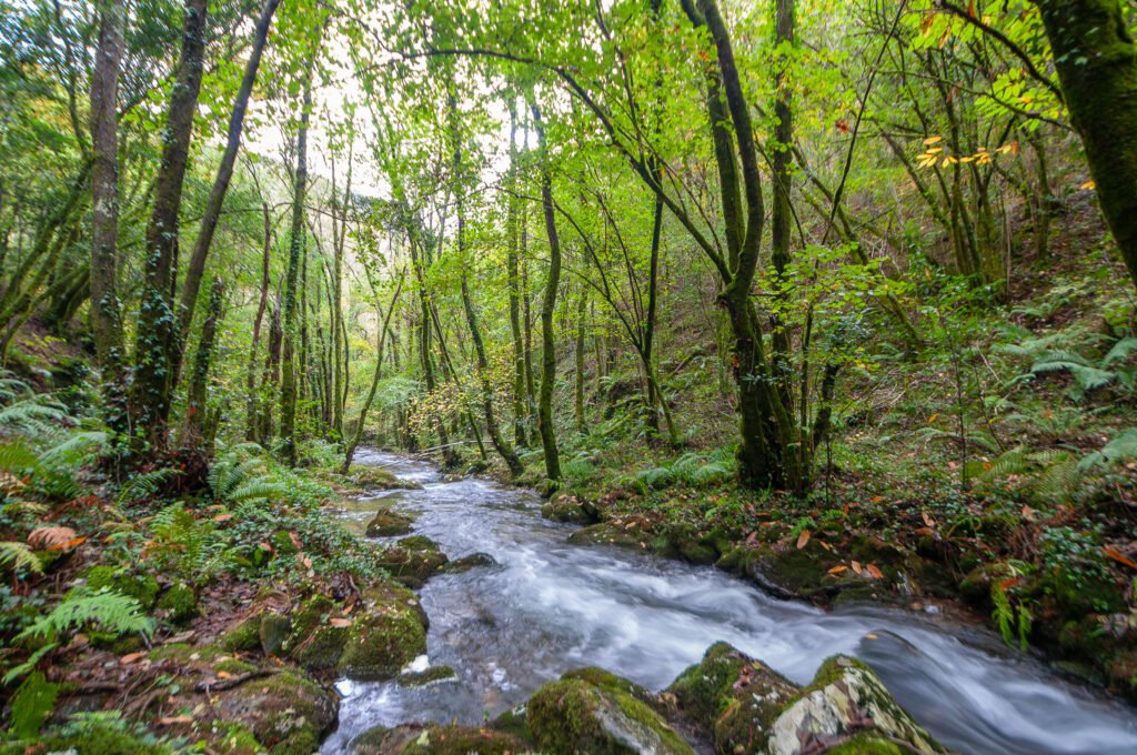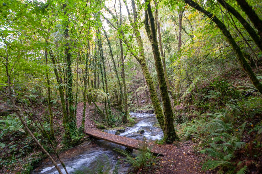 Situado en el noroeste de Galicia, el parque natural de As Fragas do Eume constituye una de las mejores representaciones de bosque atlántico de toda Europa. Verdadero pulmón gallego, alberga decenas de especies vegetales entre las que destacan robles (Quercus robur), castaños, abedules y fresnos, formando un dosel denso que limita la entrada de luz y genera un microclima húmedo y sombrío. En el sotobosque proliferan helechos de gran interés, como el Woodwardia radicans, considerado un auténtico fósil viviente que remite a épocas climáticas pasadas más cálidas y húmedas. Este tipo de vegetación, conocida como fraga, constituye un ecosistema relicto que ha desaparecido en gran parte del continente europeo.
