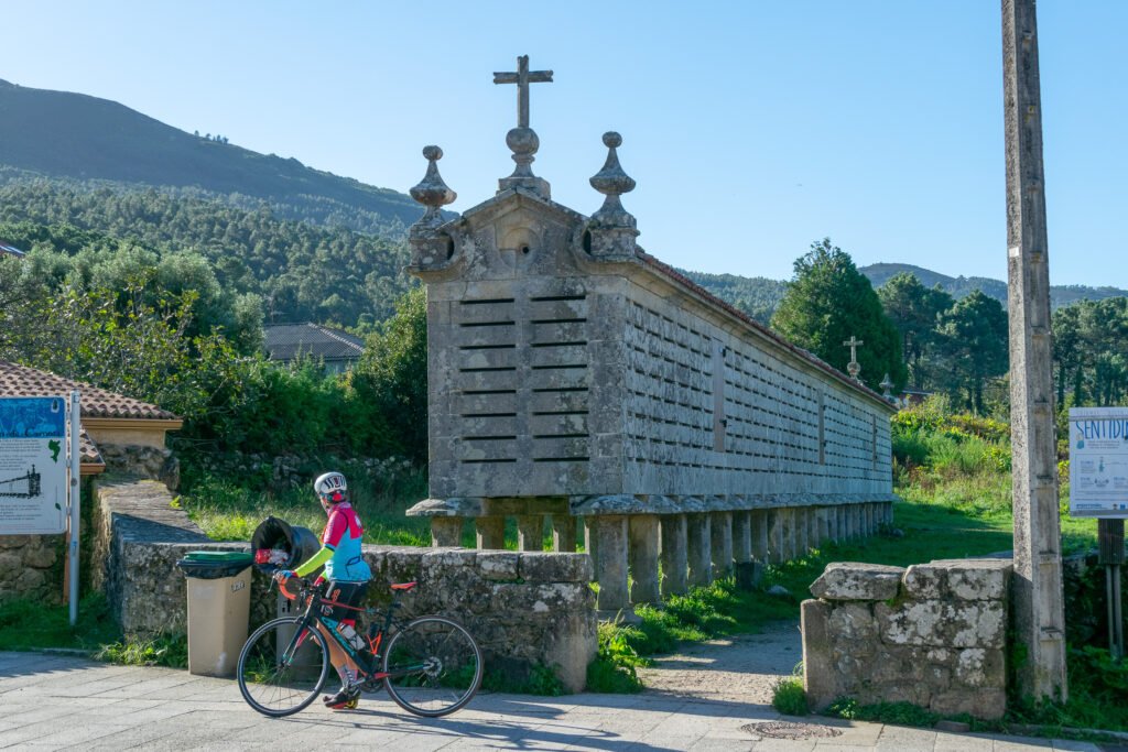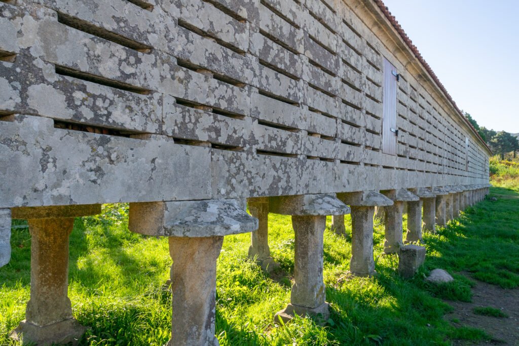 Desde el punto de vista constructivo, destaca el uso de granito local, una roca abundante en la zona que ofrece gran resistencia a la erosión y a las condiciones climáticas adversas. Los característicos “tornarratos” o discos de piedra situados sobre los pilares impiden el acceso de roedores, mostrando una solución eficaz basada en la observación del entorno natural. Además, las aberturas laterales permiten la circulación del aire, favoreciendo la conservación del grano en un clima oceánico donde la ventilación es fundamental.