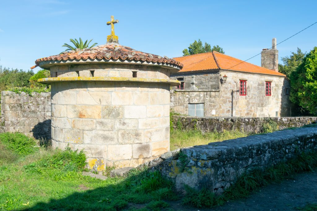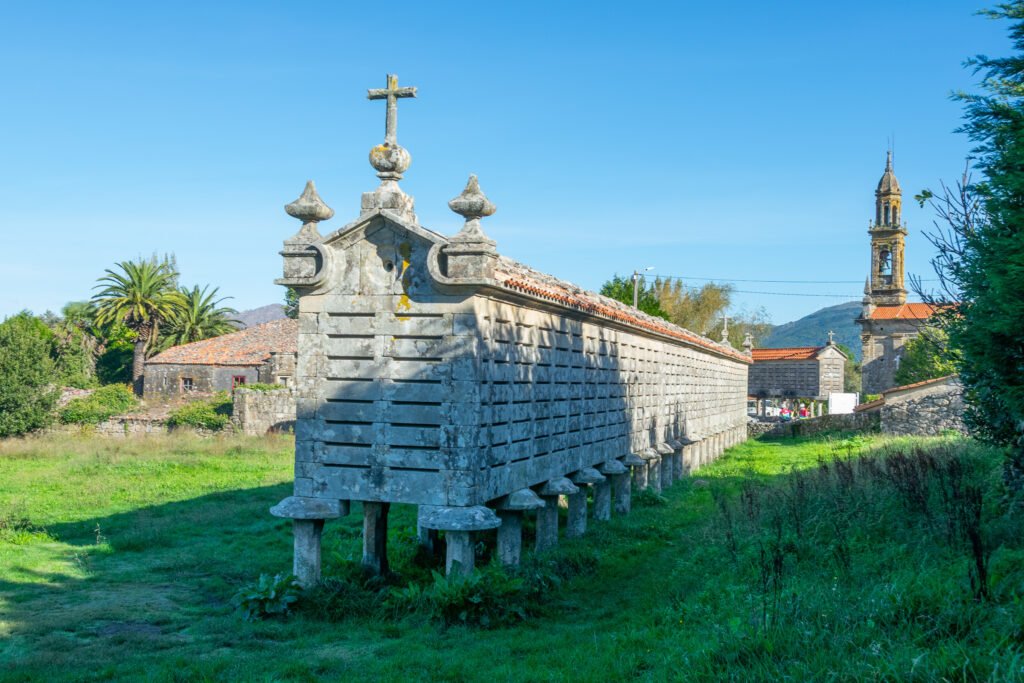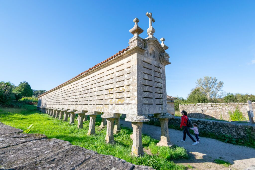 Sin duda, uno de los hórreos más conocidos de Galicia, principalmente por sus dimensiones, con 34 metros de largo y 1,90 de alto, que lo convierten, junto a su vecino de Lira, en uno de los más grandes del norte de España. Declarado Monumento Nacional, fue construido en 1768 y su estructura se mantiene sobre 22 pares de pies, con una cámara cerrada hecha en piedra de sillería, donde se suceden rendijas para la ventilación del grano almacenado. Este diseño responde a una necesidad clave: proteger los cultivos de la humedad, la fauna y la degradación, en un entorno caracterizado por lluvias frecuentes y elevada humedad ambiental.
